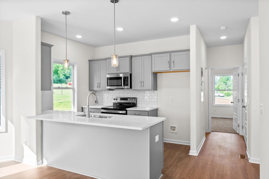 Large Covered Front Porch! NEW Construction 3 Bedroom and 2 Full Baths Primary Bedroom on Main Floor with His and Her Walk in Closets. Open Concept with Bay Like / Bump out windows in dining area. Open Kitchen features Pantry, Quartz Countertops with Overhang for Additional Seating or Serving, Light Gray Cabinets, Brushed Nickel Handles. Luxury Vinyl Plank on main floor Carpet on stairs and throughout 2nd floor. 2 Bedrooms both with walk in closets and Full Bath Upstairs. Additional attic storage space featured in each upstairs bedroom. No HOA! 1 Year New Home Warranty for Peace of Mind with Blick Homes LLC