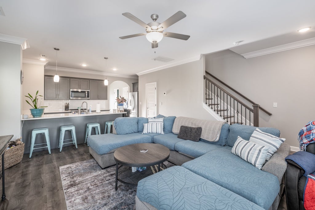 Step into this charming cottage in the sought-after Carter’s Station Village of North Columbia. Recently professionally landscaped, repainted and with carpets freshly cleaned, this home is truly move-in ready. This better than new Benton plan by Parkside Builders with so many upgrades offers a 2-bedroom, 2.5-bath layout with a versatile flex room that can easily transform into a 3rd bedroom or office. The open-concept design features soaring 9-foot ceilings and gorgeous wood laminate flooring throughout the main level. The kitchen shines with upgraded gray cabinets, white quartz countertops, crown molding downstairs, and a premium stainless steel appliance package—including a smart stove with touch screen and a brand-new refrigerator. Upstairs, the spacious owner’s suite boasts a private bath with a custom walk-in shower, with the shower and floor tile and grout professionally steamed. The secondary bedroom also enjoys its own bath, along with a conveniently located laundry area. Designer upgrades abound, including custom bathrooms, iron bannisters, wood stairs, and thoughtful details like a Ring doorbell and security system. Additional attic space with flooring provides even more convenient storage options. Storage is made simple with a shed and chest included. Enjoy easy entry from both the front and rear of the home, all while benefiting from a remarkably low $73/month HOA fee. With renting permitted, this home is not only perfect for everyday living but also an excellent investment opportunity. Ideally positioned just minutes from shopping and dining.